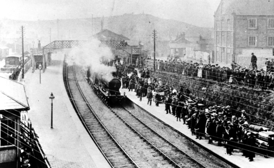 Cornish miners crowding the platform of Redruth Station in 1904 as they embark on the first stage of a journey overseas to find work. Courtesy Paddy Bradley